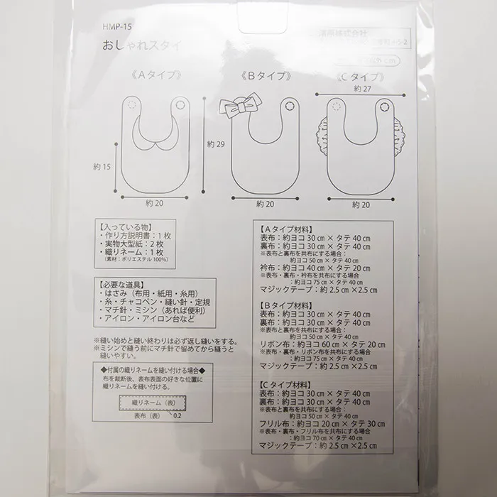 ※襟付:衿布 横40cm×縦20cm リボン付:リボン 横60cm×縦20cmとマジックテープ2.5cm×2.5cm フリル袖:袖 横20cm×縦30cm マジックテープ2.5cm×2.5cm