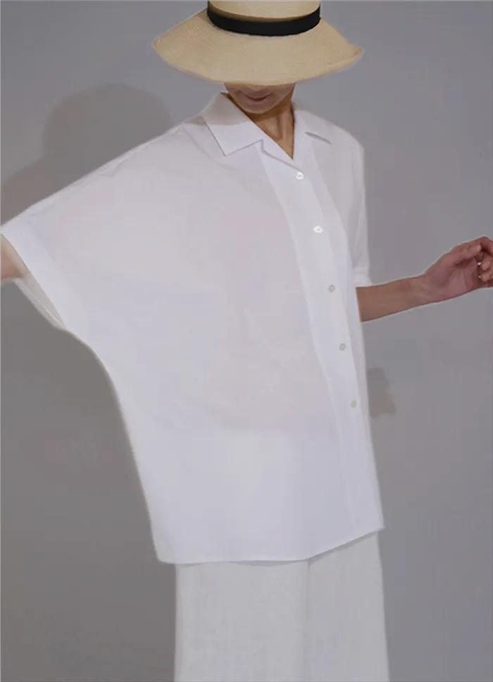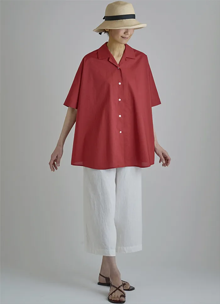 広い肩幅が半袖のように見えるフレンチスリーブのオープンカラーシャツ。