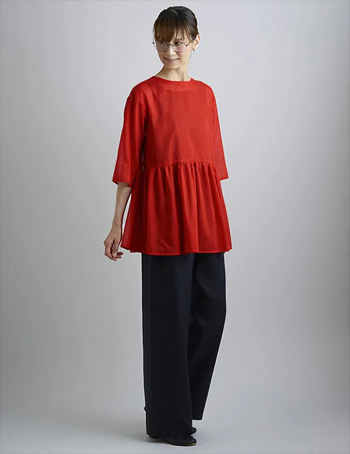 アレンジで、丈を裾から平行に48cm、袖口から平行に26cm 短くした半袖のブラウスにできます。