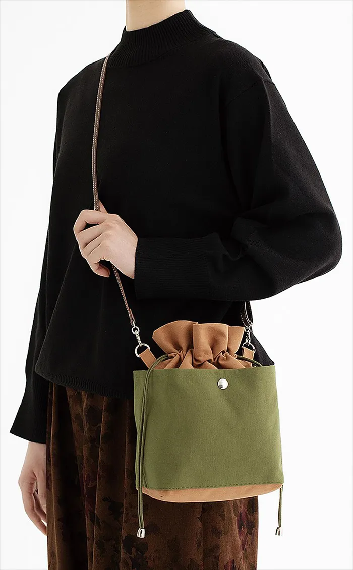 巾着タイプの袋口がくしゅっと可愛く、広めのマチでコロンとしたシルエットのバケット(バケツ型)バッグ。