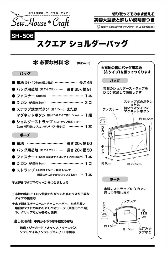 適した布地:中肉からやや厚手程度の布地(綿麻/ジャカード/オックス/キャンバス/ソフトツイル/ソフトデニム/11号帆布)