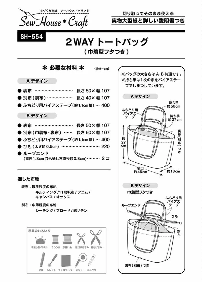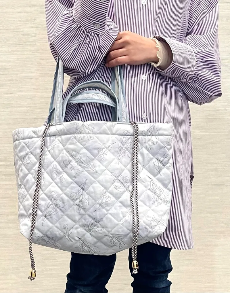 帆布やキルティング生地で作る、肩掛け(長さ約56cm)と手提げ(長さ約27cm)の2種の持ち手がついた、B4サイズが余裕で入る大きさのトートバッグ。