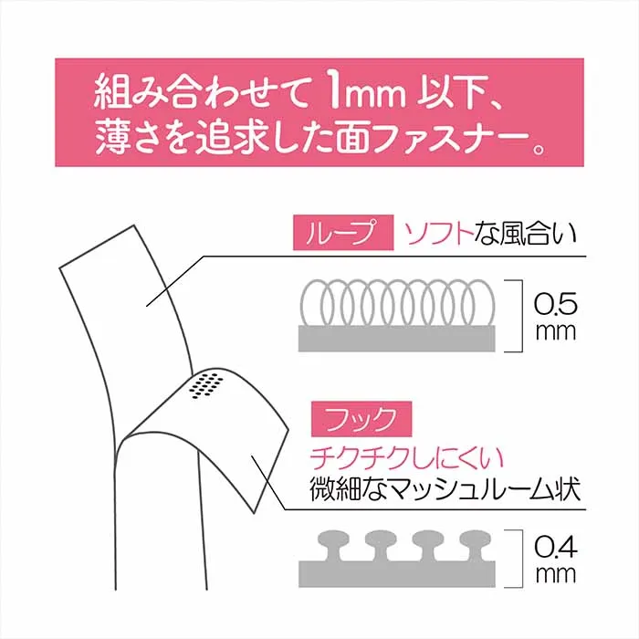 一般的な面ファスナーに比べ、厚み・重量は約3分の1、段差が目立たずスッキリとした仕上がりに。お好みのサイズにカットできるので、細やかなドール服や小物作りにオススメです。ループ面はソフトな風合い、フック面はチクチクしにくい微細なマッシュルーム状。めくりやすく、ズレに強い構造です。