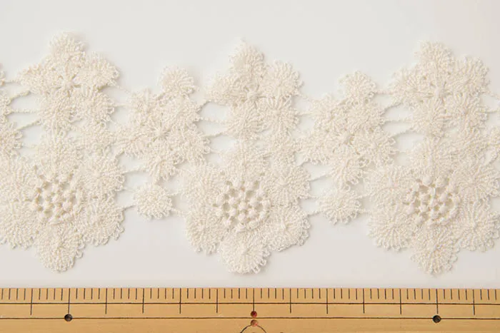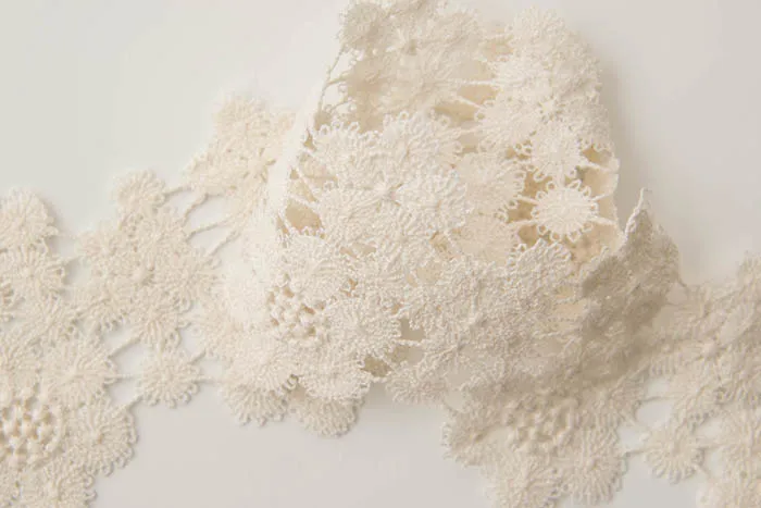エンブロイダリーレース機によって布やチュールなどに透かし模様の刺繍をほどこしたもの。このレースには生地がそのまま残ったもの、穴のあいたもの、下生地部分が溶解されて刺繍糸だけが残ったものなどがあり、レースの中でもっとも広範囲に使用されています。