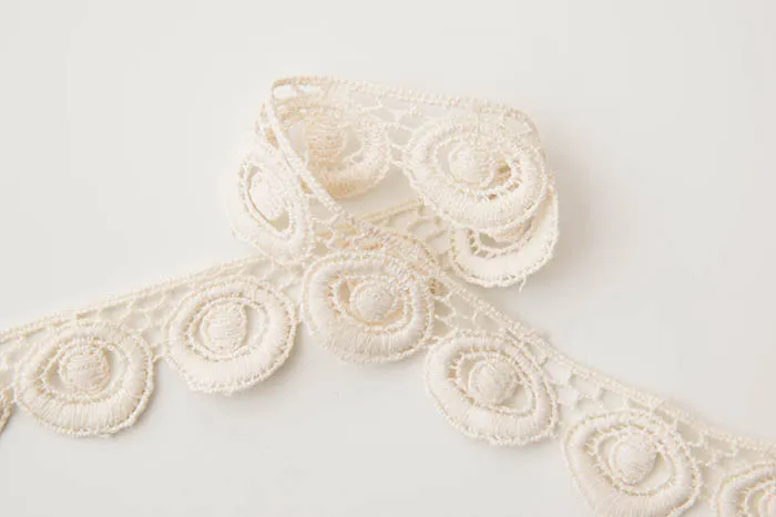 エンブロイダリーレース機によって布やチュールなどに透かし模様の刺繍をほどこしたもの。このレースには生地がそのまま残ったもの、穴のあいたもの、下生地部分が溶解されて刺繍糸だけが残ったものなどがあり、レースの中でもっとも広範囲に使用されています。