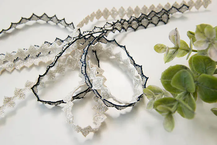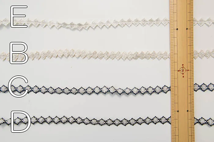 トーションレースとは、色々な種類の糸を編機の中心に向かってからめて、テープ状に編み上げて生産されるものを指します。