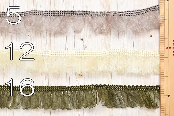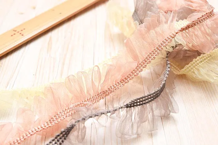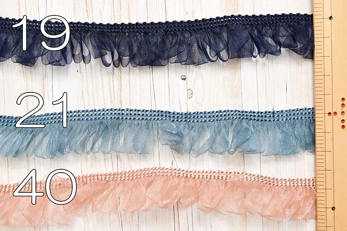 細いオーガンジーのリボンをループ状にし、ボリュームを出したフリンジリボンです。