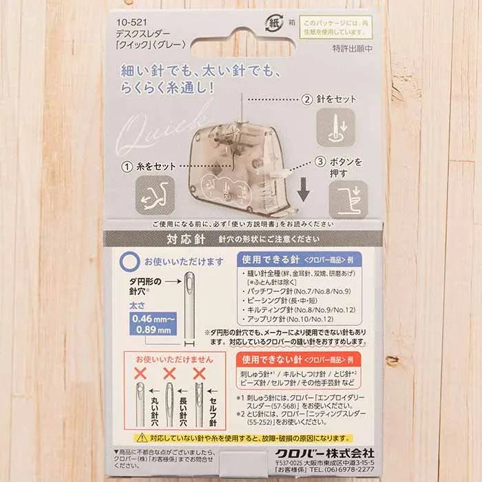細い針から太い針まで幅広い太さの針に対応。太さ0.46mmから0.89mmまでのソーイングやパッチワークのほとんどのクロバー縫い針に糸通しができます。パッチワークの針で最も細い規格(0.46mm)である、クロバー「アップリケ針」(57-331)にも対応しています。