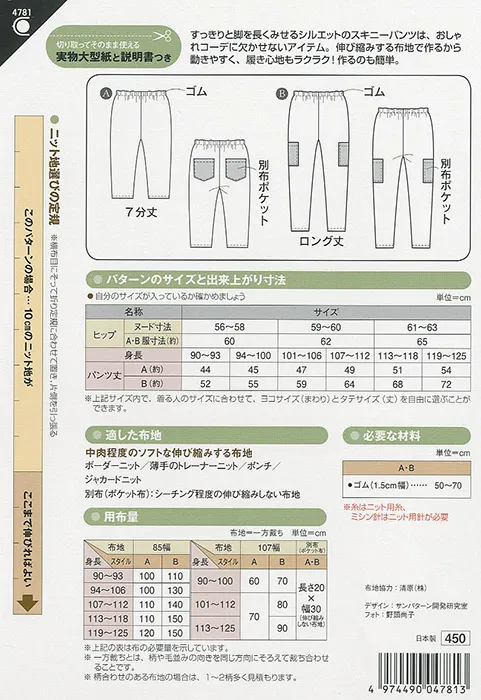 すっきりと脚を長く見せるシルエットのスキニーパンツは、おしゃれコーデに欠かせないアイテム。伸び縮みする布地で作るから、動きやすく、履き心地も楽々♪