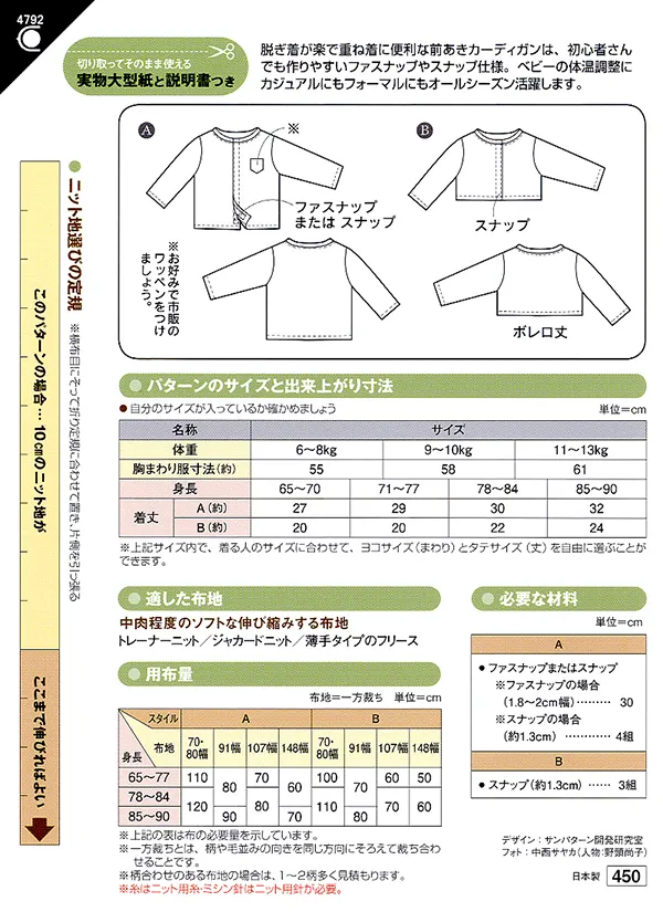 脱ぎ気が楽で重ね着に便利な前あきカーディガンは、初心者さんでも作りやすいファスナップやスナップ仕様。
