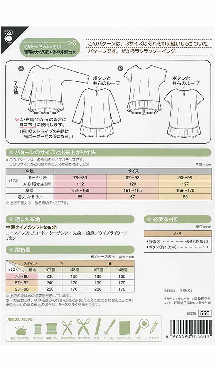 袖と身頃が続いているドルマンスリーブで作るのがカンタン!後ろワンボタン留めのかぶりタイプ。3サイズ縫いしろつき。