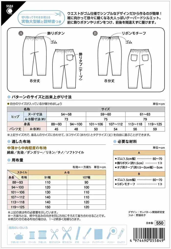 ウエストがゴム仕様でシンプルなデザインの初心者さんでも簡単に作れるこども用パンツ。8分丈で、裾に向かって徐々に細くなる大人っぽいテーパードシルエット。