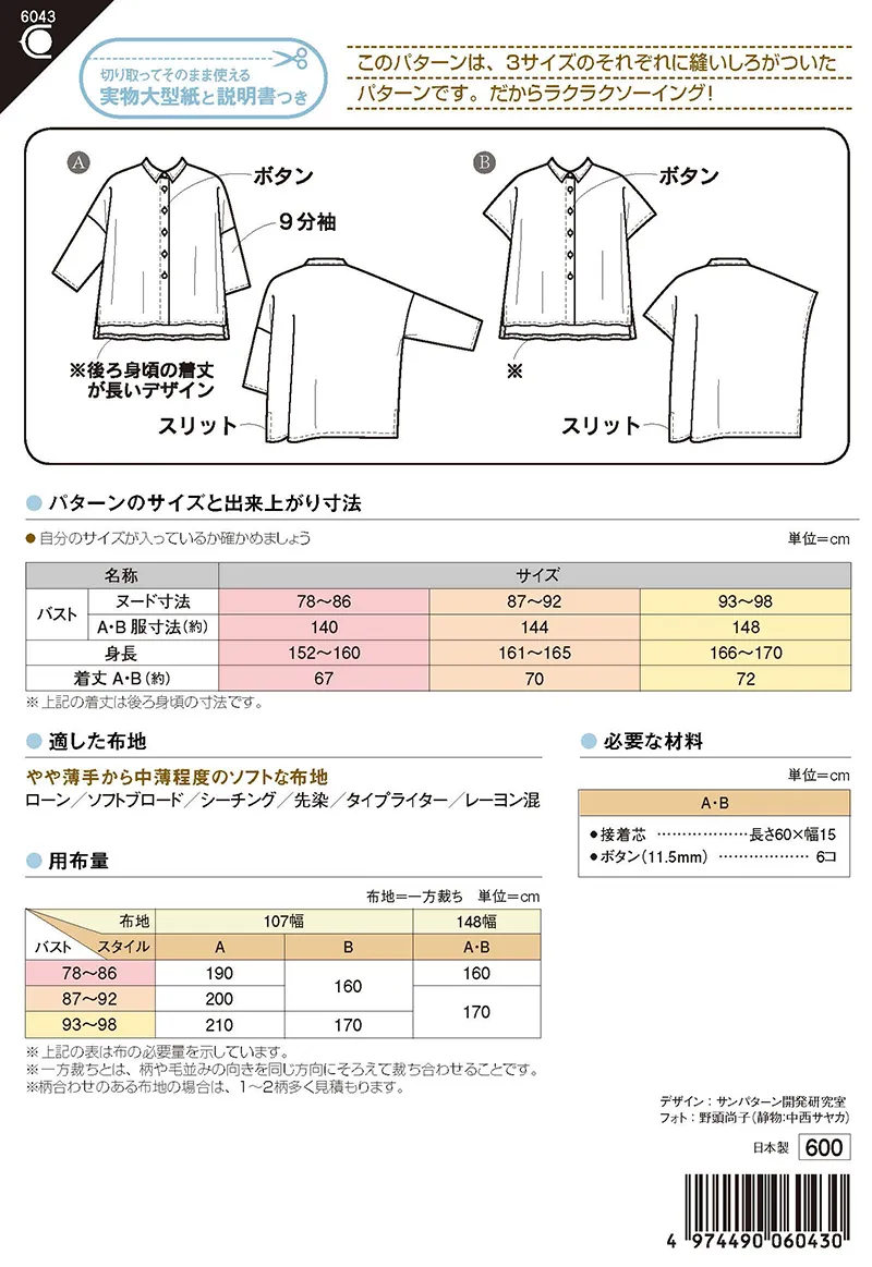 9分袖デザインと、暑い日に活躍する袖なし(ポンチョタイプ)デザインが作れます。
