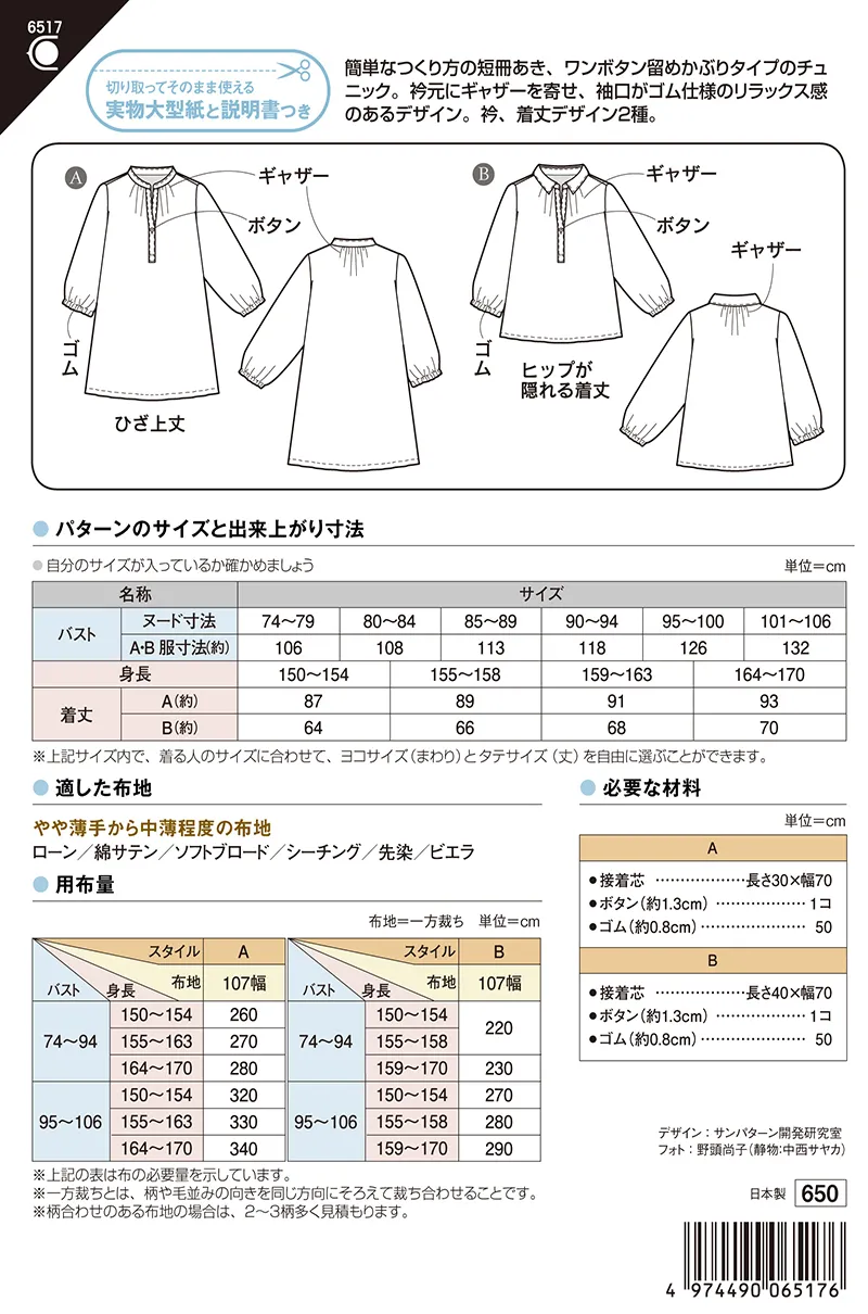 簡単なつくり方の短冊あき、ワンボタン留めかぶりタイプのチュニック。