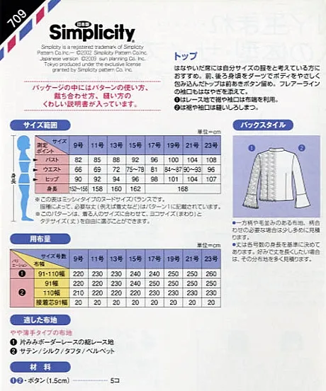 前、後ろ身頃のダーツでボディをやさしく包み込んだトップは前あきボタン留め。