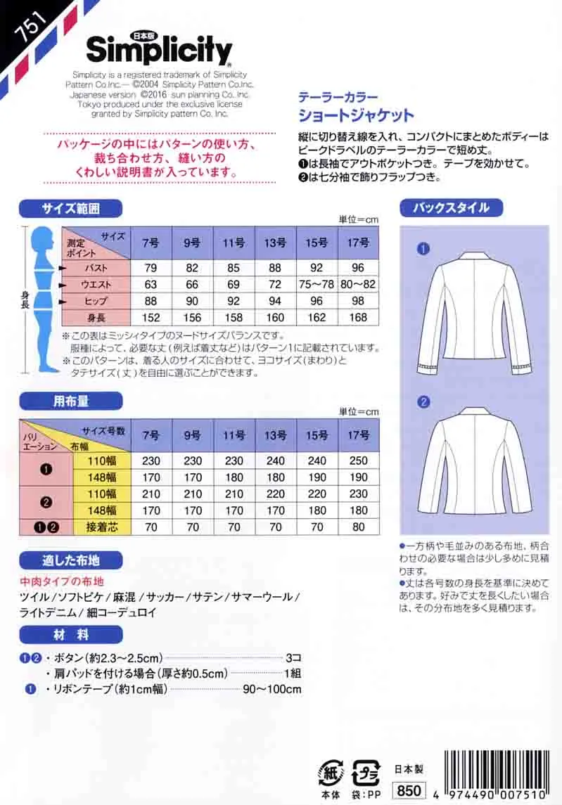 パターン 型紙 テーラーカラーショートジャケット