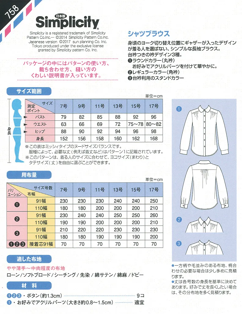 台衿つきのラウンドカラー(丸衿)、台衿つきのレギュラーカラー(角衿)、台衿利用のスタンドカラーのデザイン3種。