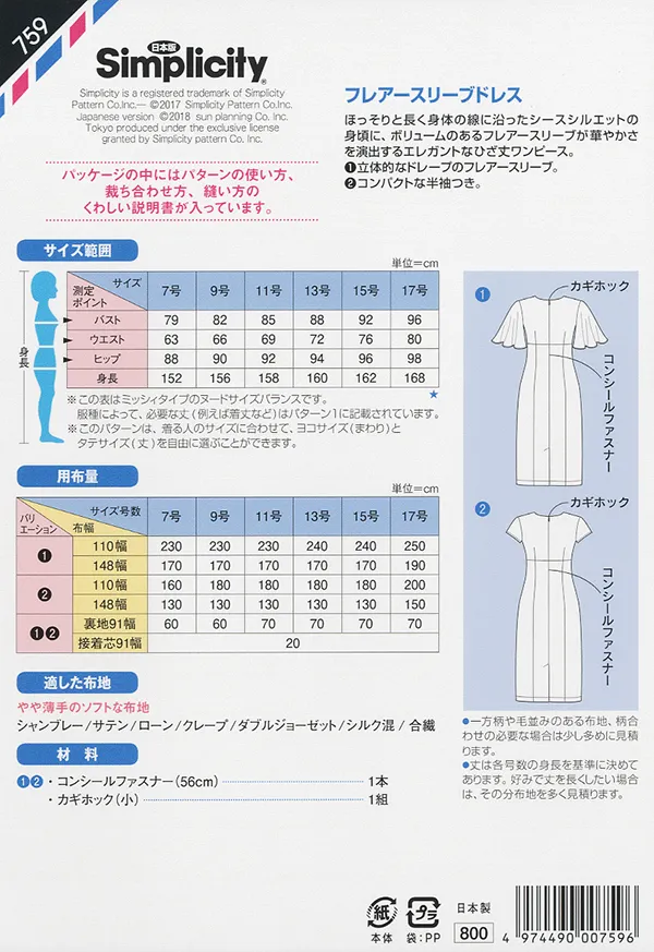 ほっそりと長く身体の線に沿ったシースシルエットの身頃に、ボリュームのあるフレアースリーブが華やかさを演出するエレガントなひざ丈ワンピース。コンパクトな半袖デザインも作れます。