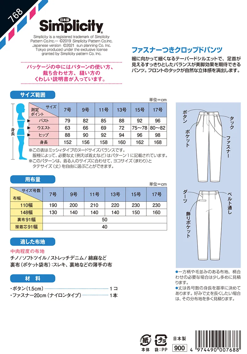 パターン・型紙 ファスナーつき クロップドパンツ