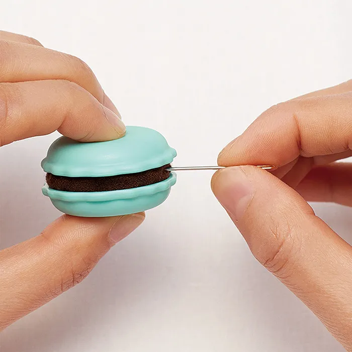針みがきの使い方は、(1)中央のクッション部に針の先をゆっくり差し込みます。(2)上下の樹脂部分を指で押さえ、針をはさみつけます。(3)針を引き抜きます。
