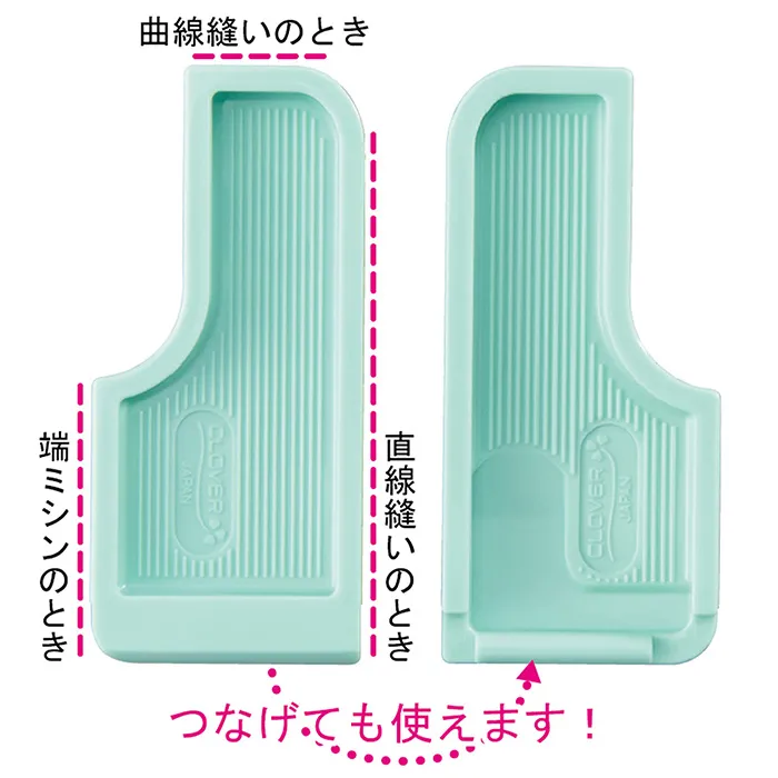 ガイドの向きや組み合わせで、「直線縫い」、「曲線縫い」、「端ミシン」、「ひもを縫うとき」とさまざまな縫い方に対応できます。