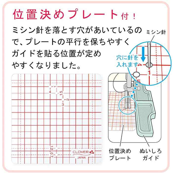ミシン針を落とす穴があいている位置決めプレート付で、ガイドを貼る位置が定めやすいです。
