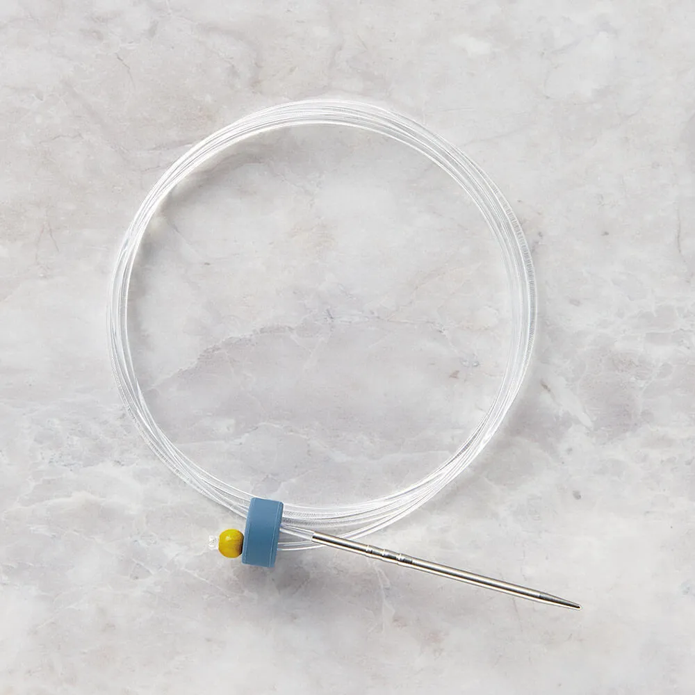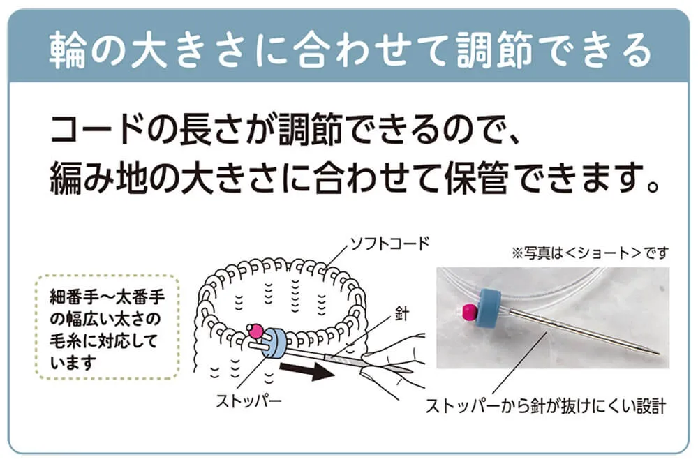 編み目が移しやすく、コードの長さが調節できるので、編み地の大きさに合わせて保管できます。