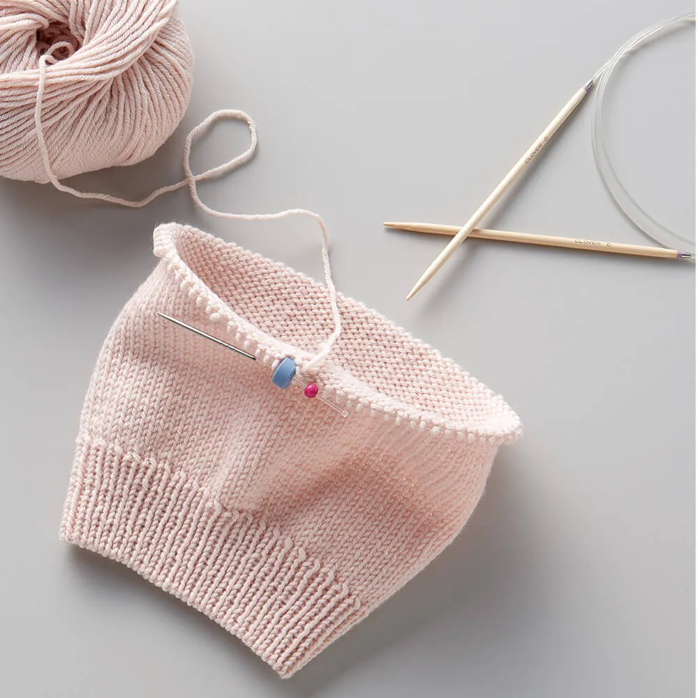 袖、衿まわり、身頃など、輪になった編み目を休めるときに使います。