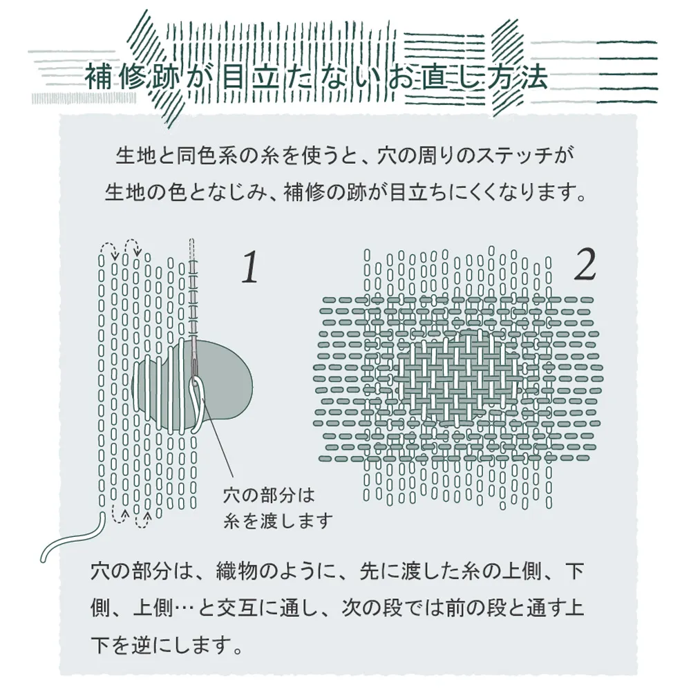 ダーニングとは、ヨーロッパで伝統的に行われている、衣類の穴あきやすりきれた箇所を修繕する針仕事です。