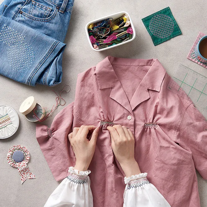 水で消えるタイプの水性チャコペン(24-414など)、25番刺しゅう糸、刺しゅう針です。付け襟やTシャツ、子ども服など、市販のアイテムにスモッキングをプラスしても楽しめます。