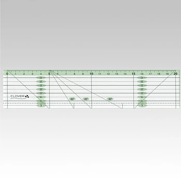 製図、型紙作り、キルティングライン、印つけなどペンを使っての作業に最適なすっきり見やすい平行線&角度線が入ったシンプルな定規です。