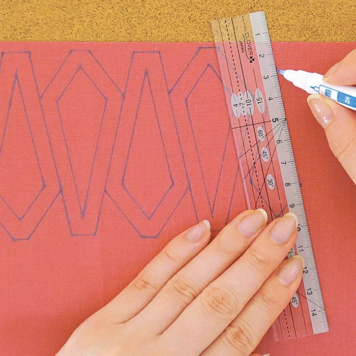 また、定規の端の目盛の背景「カラーライン」は、縫いしろ幅にあわせた7 mm(ストリップ定規は7.5 mm)なので、縫いしろをとる作業も楽にできます。