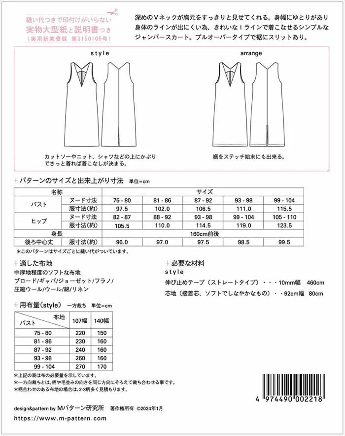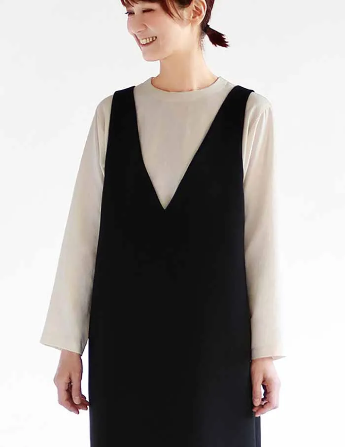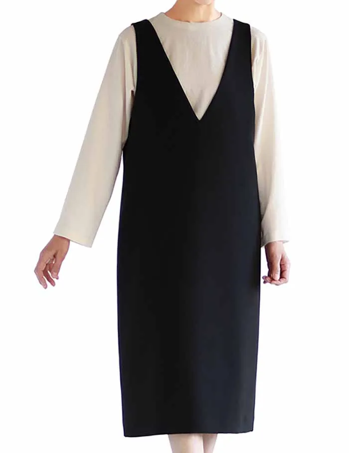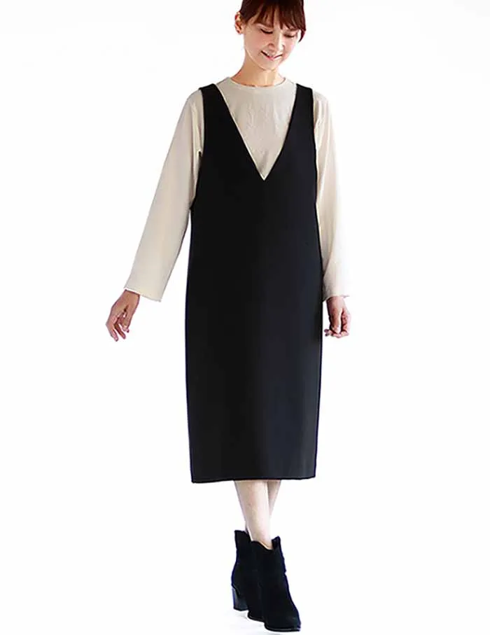 深めのVネックが胸元をすっきりと見せる、身幅にゆとりがあり、身体のラインが出にくい綺麗なIラインで着こなせるシンプルなジャンパースカート。