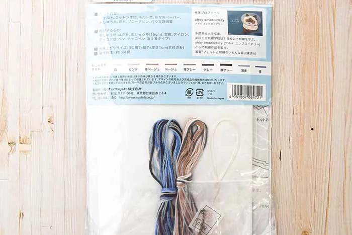 セット内容 : フェルト、コットン生地、キルト芯、転写用パーパー、刺しゅう糸、麻糸、ブローチピン、作り方説明書