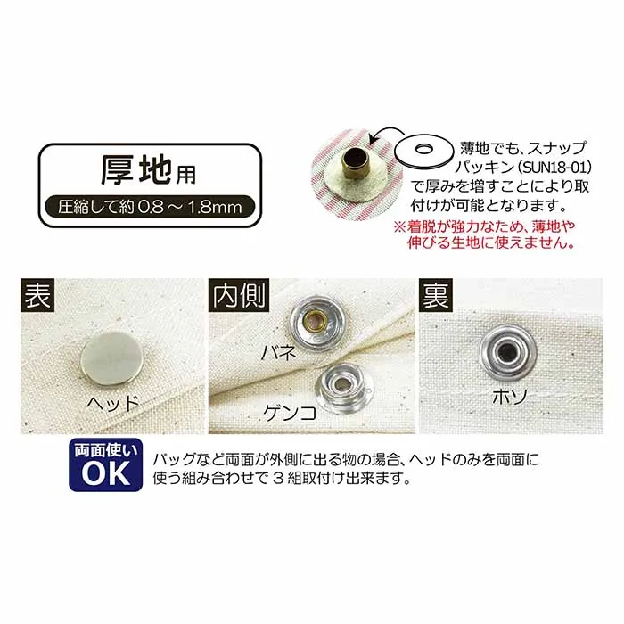 ※薄地でもスナップパッキンで厚みを増すことで取り付けが可能。