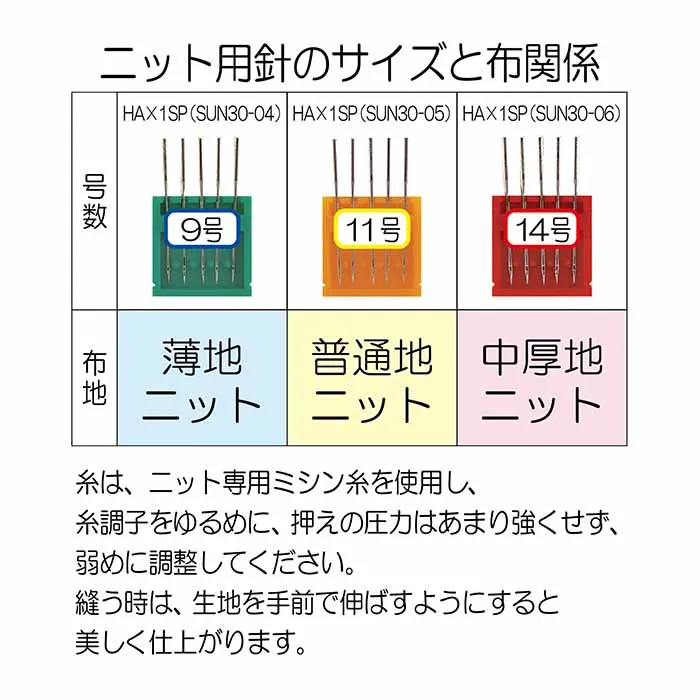 9号(薄地ニット用)、11号(普通地ニット用)、14号(厚地ニット用)がございます。