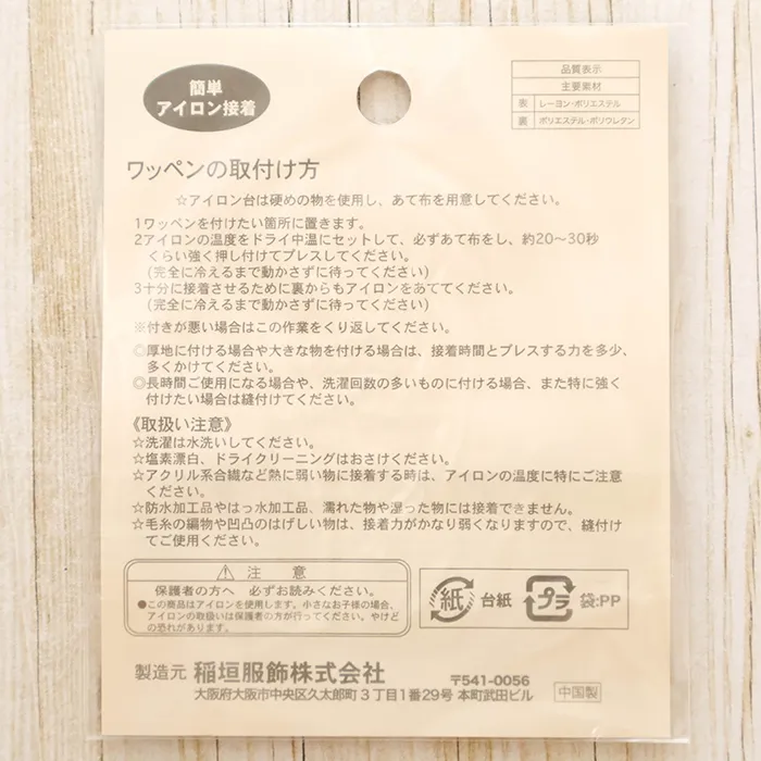 ※アイロン接着強度は、永遠に持続するものではありません。特にこのシリーズはデザイン上、接着面積の少ない部分がありますので、長時間のご使用や、洗濯回数の多いものなどは、縫い付けてのご使用や、洗濯時の手洗い等をおすすめします。
