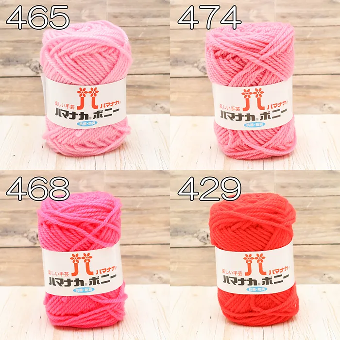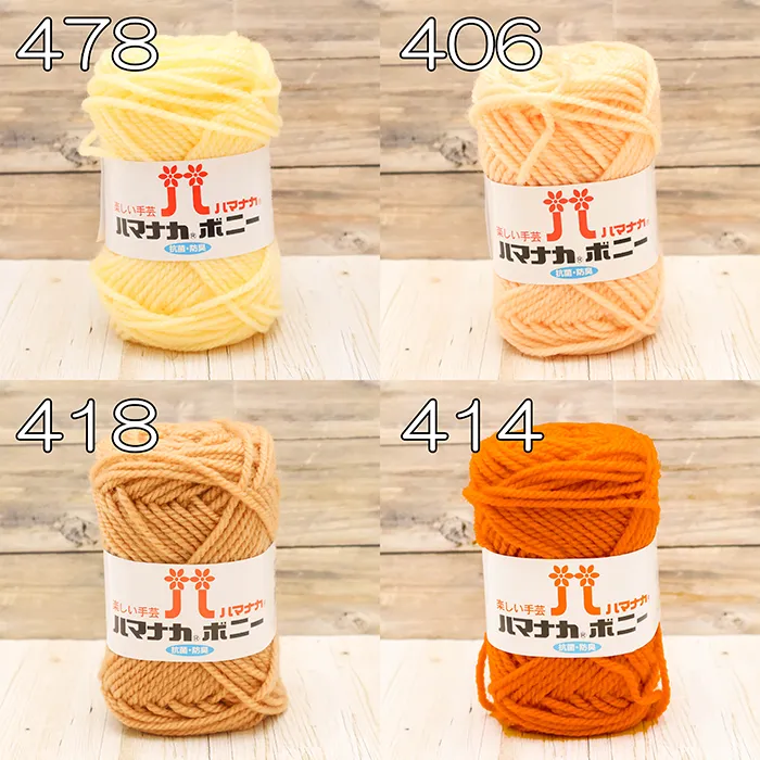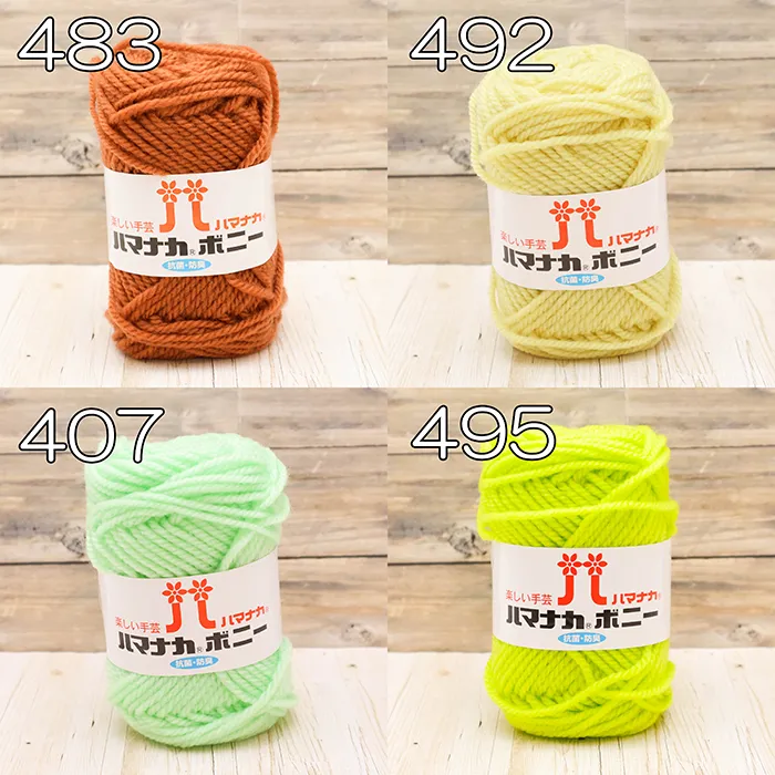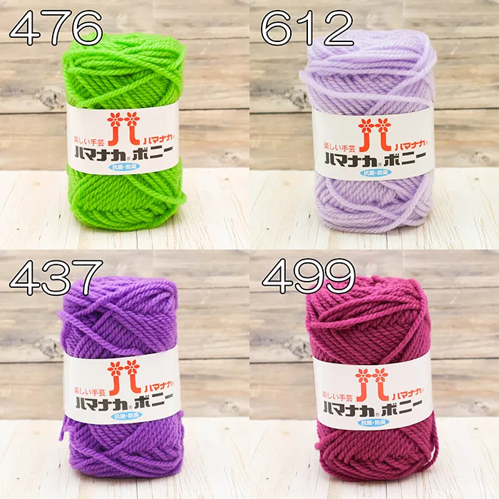 ハマナカボニーシリーズはアクリルを原料段階で染色(トップ染め)したあと、紡績とふくらむ加工を施し、ソフトでふっくらとしたボリューム感のある糸に仕上げています。