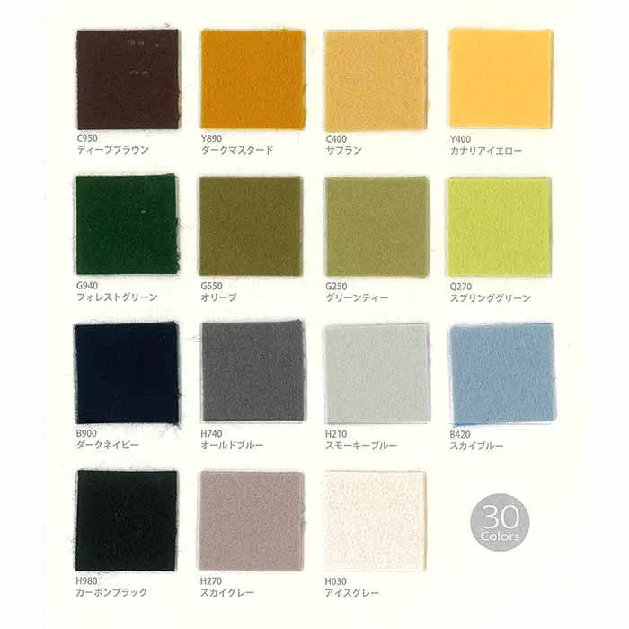 全30色の美しいニュアンスカラーが魅力の国産フェルトです。