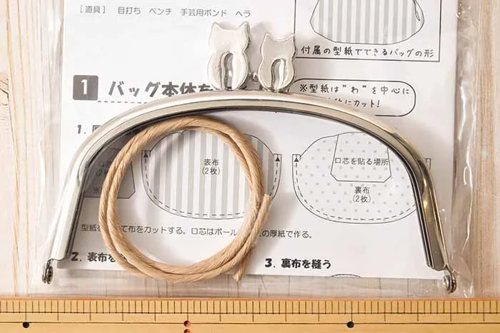 このがま口の他に、布・ボンド・ペンチ・がま口専用差し込み器具(または目打ち)をご用意ください。