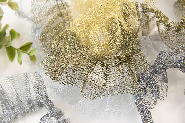 細かいチュールの様な生地で、ラメ糸が光り上品な仕上がりに。