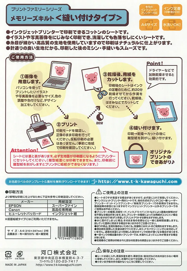 イラストや写真画像をにじみなく印刷でき、洗濯しても色落ちしにくいシートです。