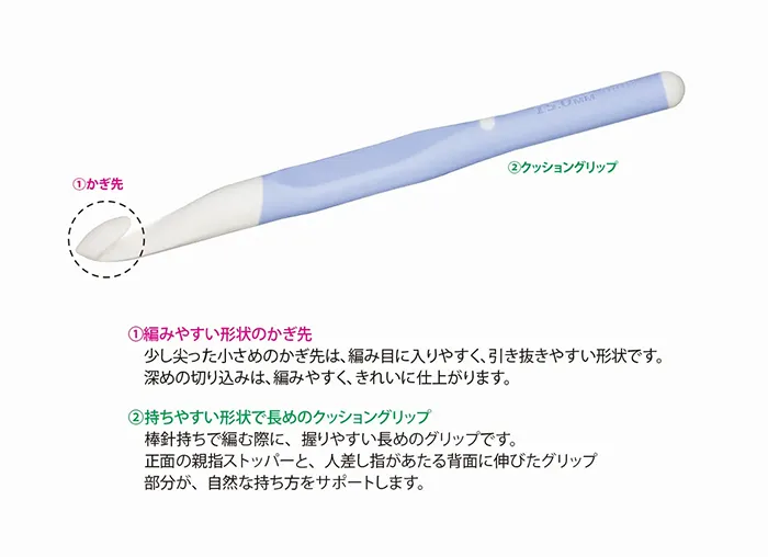 長時間使用しても疲れにくく手にやさしいクッショングリップ付きのかぎ針です。