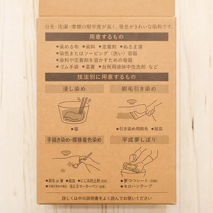 商品構成:染料5g/フィルム袋x4、定着剤10g/フィルム袋x8、説明書、個装箱