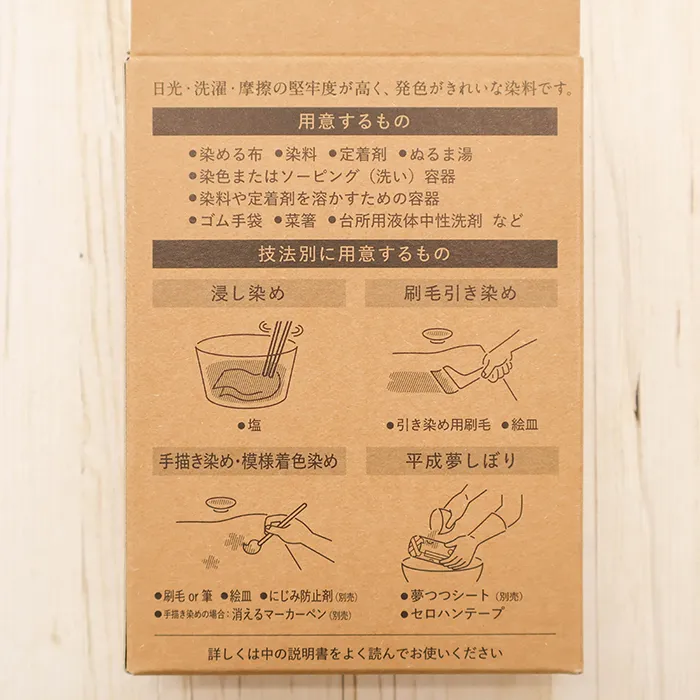 浸し染め・絞り染め・手描き染め・ろうけつ染めなど、色々な技法が楽しめる染料です。