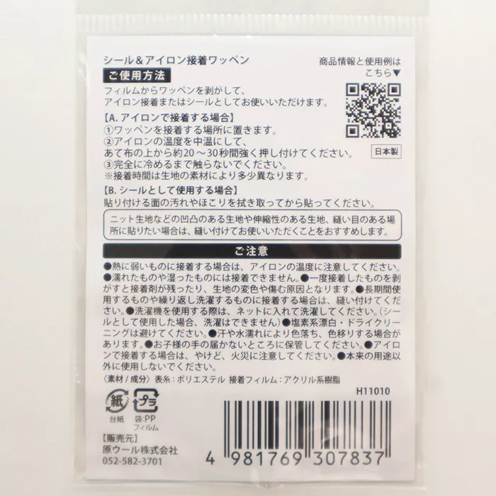フィルムからワッペンを剥がして、アイロン、またはシールとしてお使いいただけます。