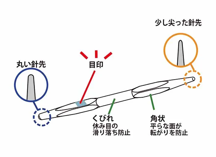 ・針の中央部がくびれ、両端に向かって太く、角状になっています。休ませている編み目が滑り落ちにくいです。