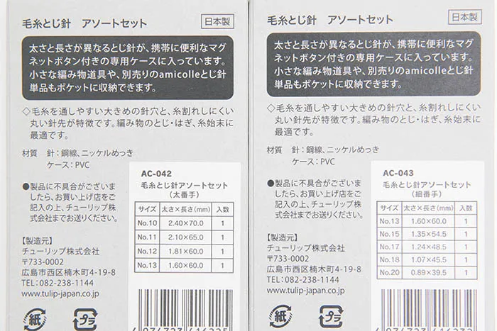 毛糸を通しやすい大き目の針穴と、糸割れしにくい丸い針先が特徴です。編み物のとじ・はぎ、糸始末に最適です。