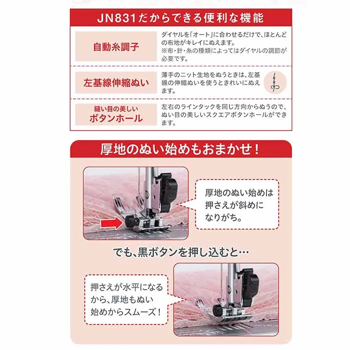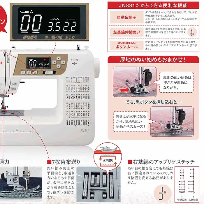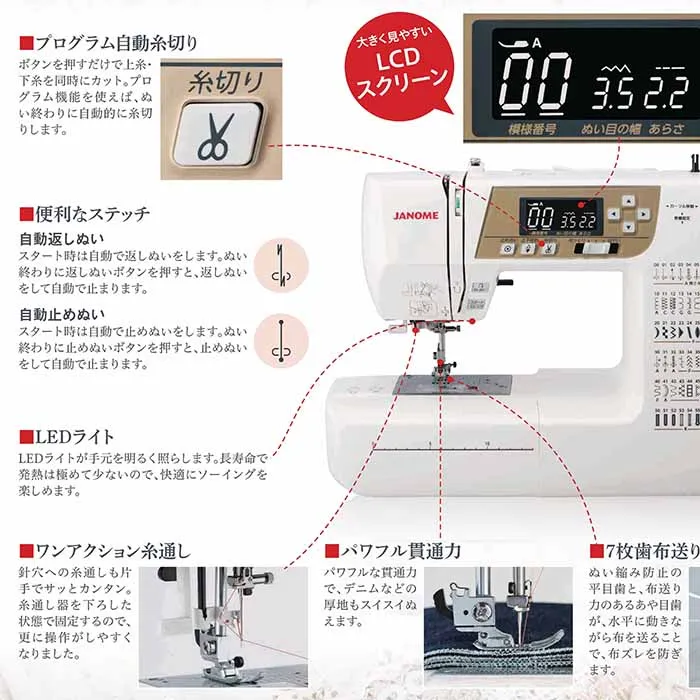 プログラム自動糸切り、便利なステッチ(自動返しぬい、自動止めぬい)、LEDライト、ワンアクション糸通し、パワフル貫通力、7枚歯布送り、右基線のアップリケステッチ、自動糸調子、左基線伸縮ぬい、ボタンホール、LCDスクリーン