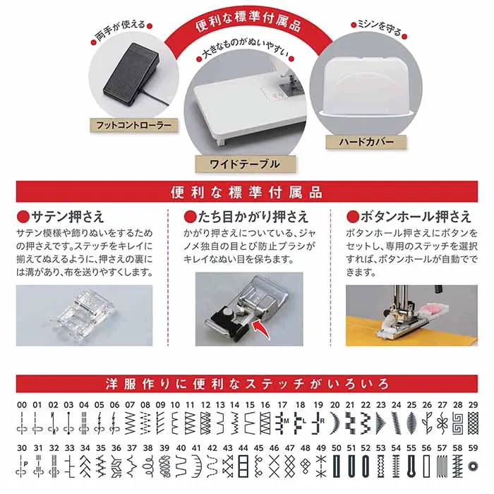 ・洋服作りに便利なステッチを59種類搭載